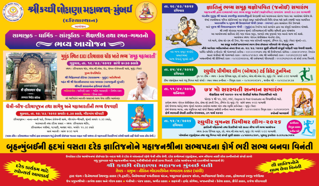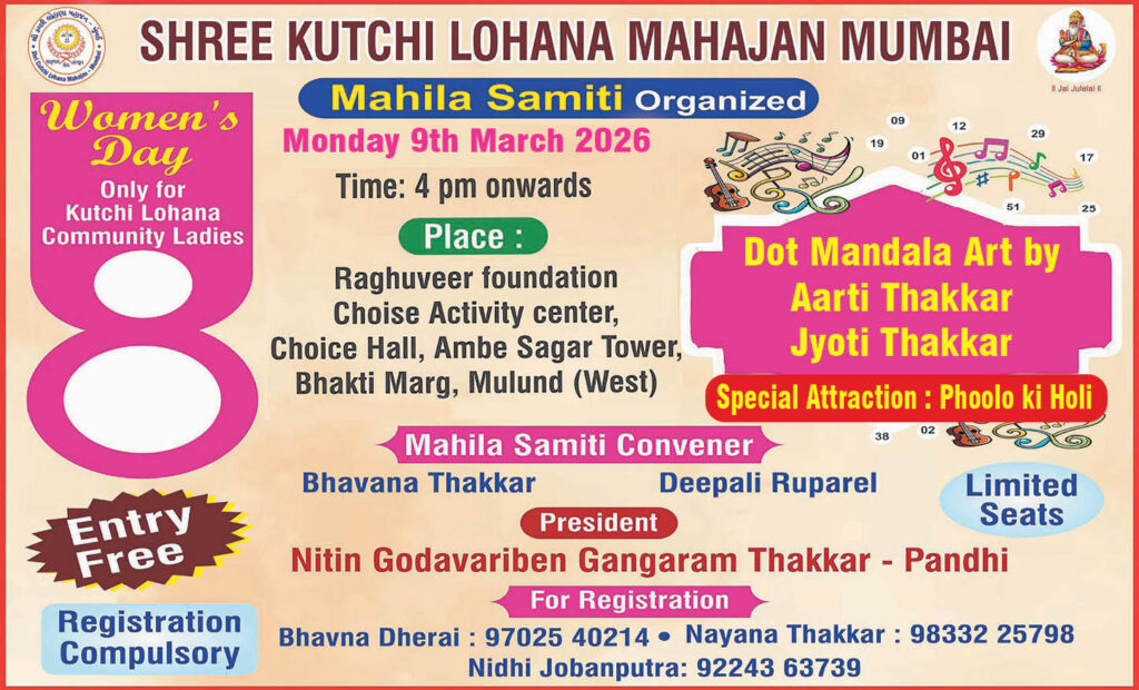 શ્રી કચ્છી લોહાણા મહાજન -મુંબઈ (મહિલા સમિતિ) દ્વારા ફક્ત કચ્છી લોહાણા મહિલાઓ માટે વુમન્સ ડે નિમિત્તે એક વિશેષ કાર્યક્રમનું આયોજન સોમવાર, તા.૯ માર્ચ ૨૦૨૬ના રોજ સાંજે ૪ વાગ્યાથી રઘુવીર ફાઉન્ડેશન, ચોઈસ એક્ટિવિટી સેન્ટર, ચોઈસ હોલ, અંબેસાગર ટાવર, ભક્તિ માર્ગ, મુલુન્ડ (વેસ્ટ) ખાતે કરવામાં આવ્યું છે.