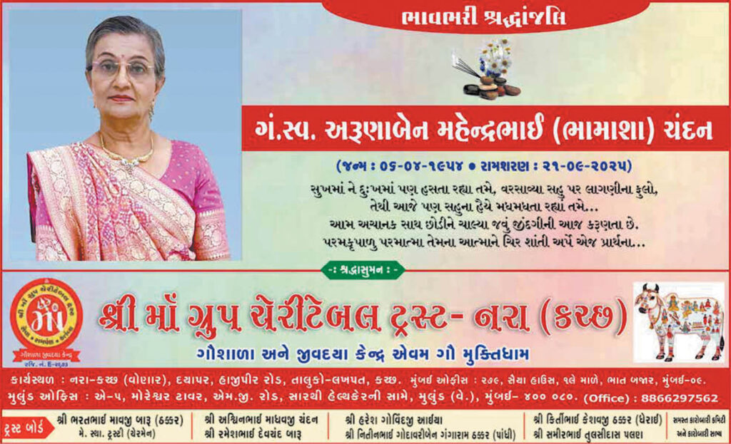 હર્ષ ભૂપેન્દ્ર ગણાત્રા (ઉં. વ. ૩૪) કચ્છ ગામ તેરા હાલ માટુંગા તા. ૨૭-૯-૨૫ના રામશરણ પામ્યા છે. સ્વ. ચાગબાઇ-સ્વ. નરશી (કાકુભાઇ) ગણાત્રાનાં પૌત્ર. પ્રીતિ (પ્રતિમા)-ભૂપેન્દ્રના પુત્ર. રચિતાનાં પતિ. હરનિશ, મારિશા કપિલ ચોથાણીના ભાઇ. સ્વ. લીલાવતી-રાજવીરસિંહના જમાઇ. દિનેશસિંહ-મંજરી સિંહના બનેવી. પ્રાર્થનાસભા તા. ૨૯-૯-૨૫ સોમવારના શ્રીનારાયણજી શામજી મહાજનવાડી, ૪૫૨, ભાઉદાજી રોડ, મહેશ્વરી ઉઘાન, માટુંગા (ઇસ્ટ), સાંજે ૪થી ૫.૩૦.