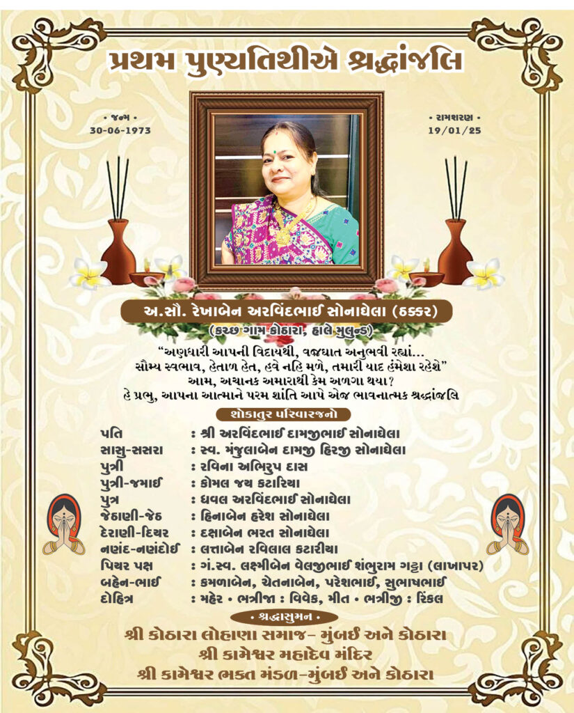 નાંગલપુરના મંજુલા ધીરજલાલ દેઢીયા (ઉ. વ. ૬૫) ૧૭-૧-૨૬નાં અવસાન પામેલ છે. રતનબેન કોરશી નથુના પુત્રવધુ. મઠાંબેન વસનજીના પુત્રી. ખારૂઆના કુસુમ અરવિંદ, રામાણીયા જયશ્રી વિનયના બેન. પ્રાર્થના રાખેલ નથી. ઠે. ધીરજ કોરશી, એ-૨, વિસામો, નવનીતનગર, દેશલેપાડા, ડોંબીવલી (ઇ.)
