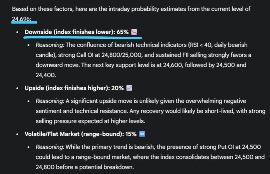 - 29 Sep 2025 09:50 AM (IST)આજે બજારની ચાલ કેવી રહેશેબજારની ચાલ:આજે, 29 સપ્ટેમ્બરના રોજ Range-bound થી Slightly Bullish Bias માં છે. High probability: Market will stay above 24,700 Resistance near 24,900–25,000 will limit sharp upmove Expiry gravitation point is 24,800