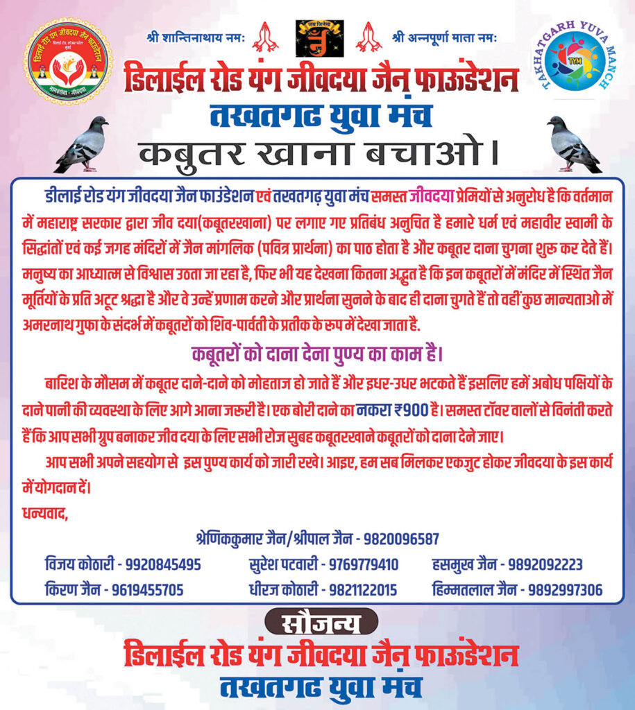 ભુલેશ્વરના મેઇન રોડ પરના શ્રી પંચમુખી હનુમાનજી મંદિરની સામે આવેલા શ્રી જલરામબાપાના મંદિરમાં પણ આવતી કાલે રાતે ૧૧થી ૧૨ વાગ્યા દરમ્યાન શ્રી કૃષ્ણ જન્મોત્સવ ઊજવાશે અને લાલાનું પારણું ઝુલાવાશે. મંદિરના મુખ્યાજી પૂ. હેમાંશુજી ત્રિવેદી જન્માષ્ટમીની સઘળી સેવાઓ શ્રી ઠાકોરજીને અર્પણ કરશે. વધુ વિગતો માટે મંદિરના મૅનેજર સુભાષ જાનીનો 70450 88434 નંબર પર સંપર્ક કરવો.